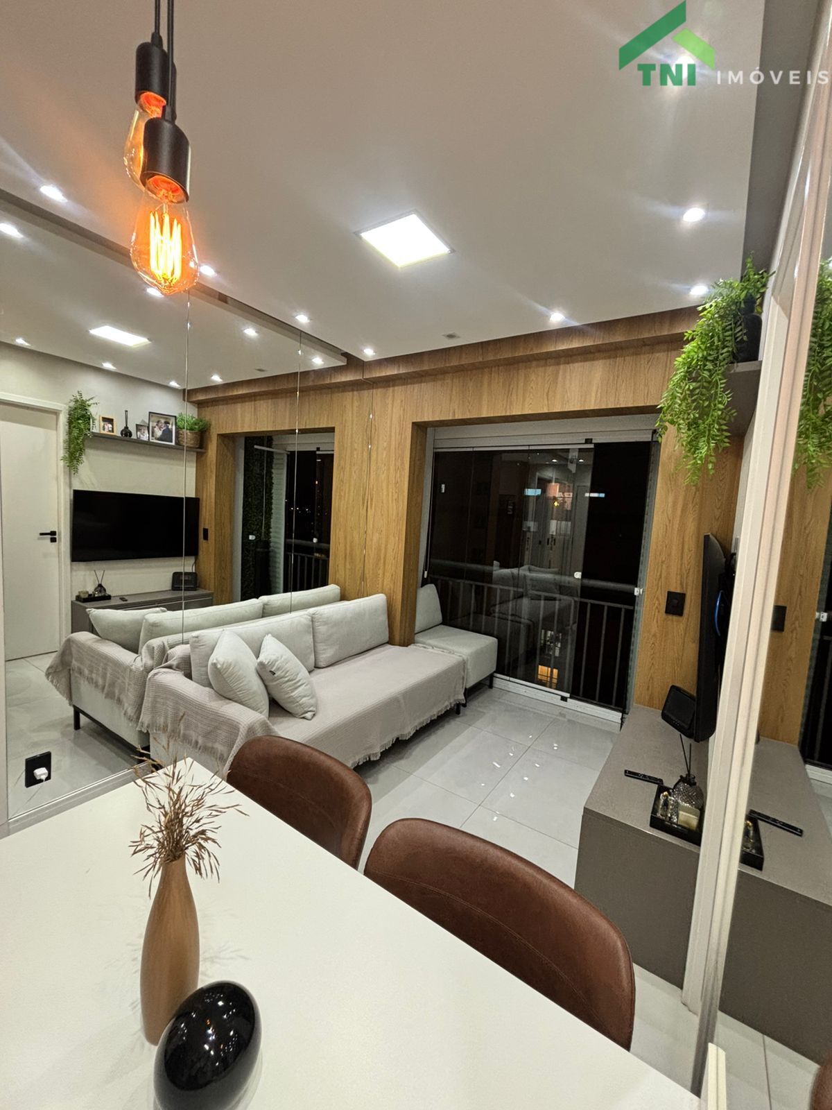 - Decoração Moderna: Parede da sala revestida em espelho para ampliar o ambiente e iluminação cuidadosamente planejada com luzes brancas e LED amarelo, criando diferentes cenários.