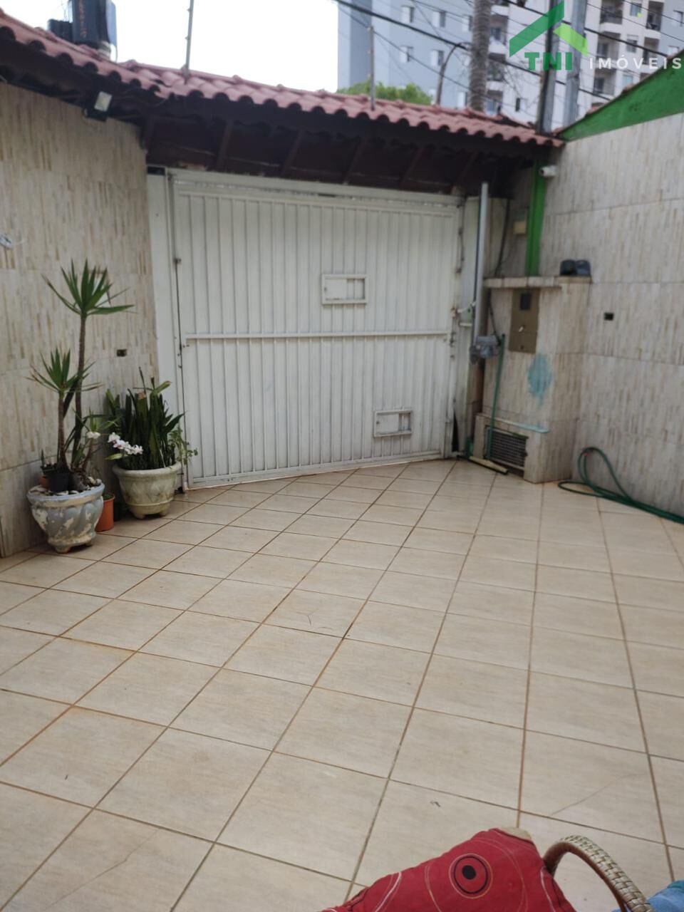 Área de serviço com churrasqueira, e corredor lateral.